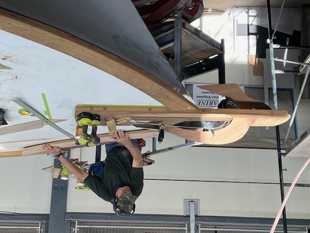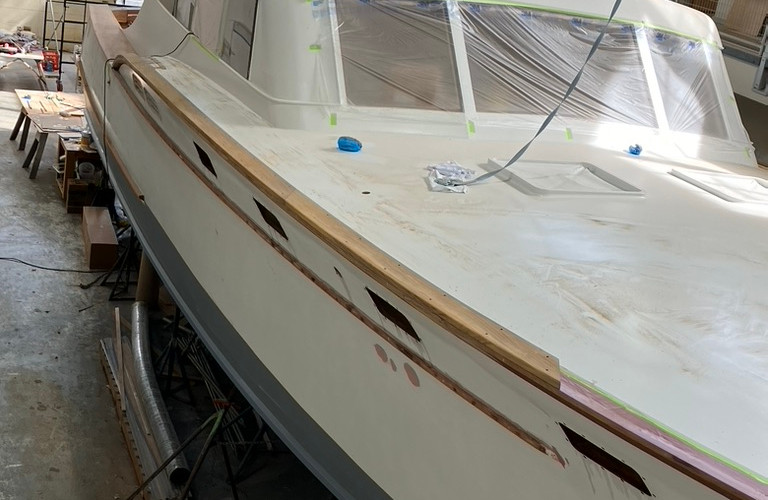Additional, not as pretty but important, work has been completed--most systems, the engine installation, the generator and battery and shore power systems have been installed. The keel worm shoe is being completed and all top side preparation, faring and priming have been completed. We've found no more termite or dry rot damage in the last a few months (whew!), all structural repairs have been made. The new carbon fiber flybridge hardtop started being laid up this week and the SS rail packages are being organized.